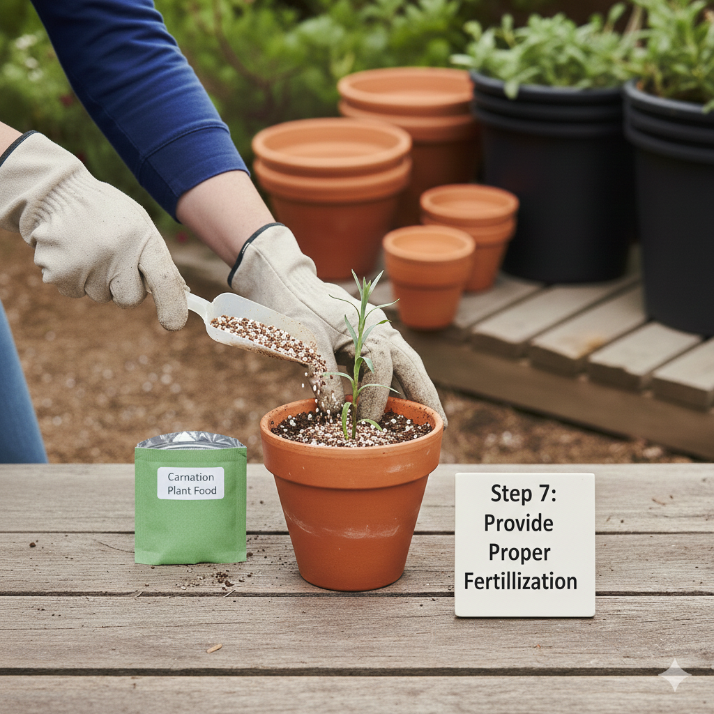Feed your carnation plants every 2–3 weeks using a balanced liquid fertilizer. Organic compost or slow-release fertilizers also work well. Avoid excessive nitrogen, as it promotes leaves rather than flowers.